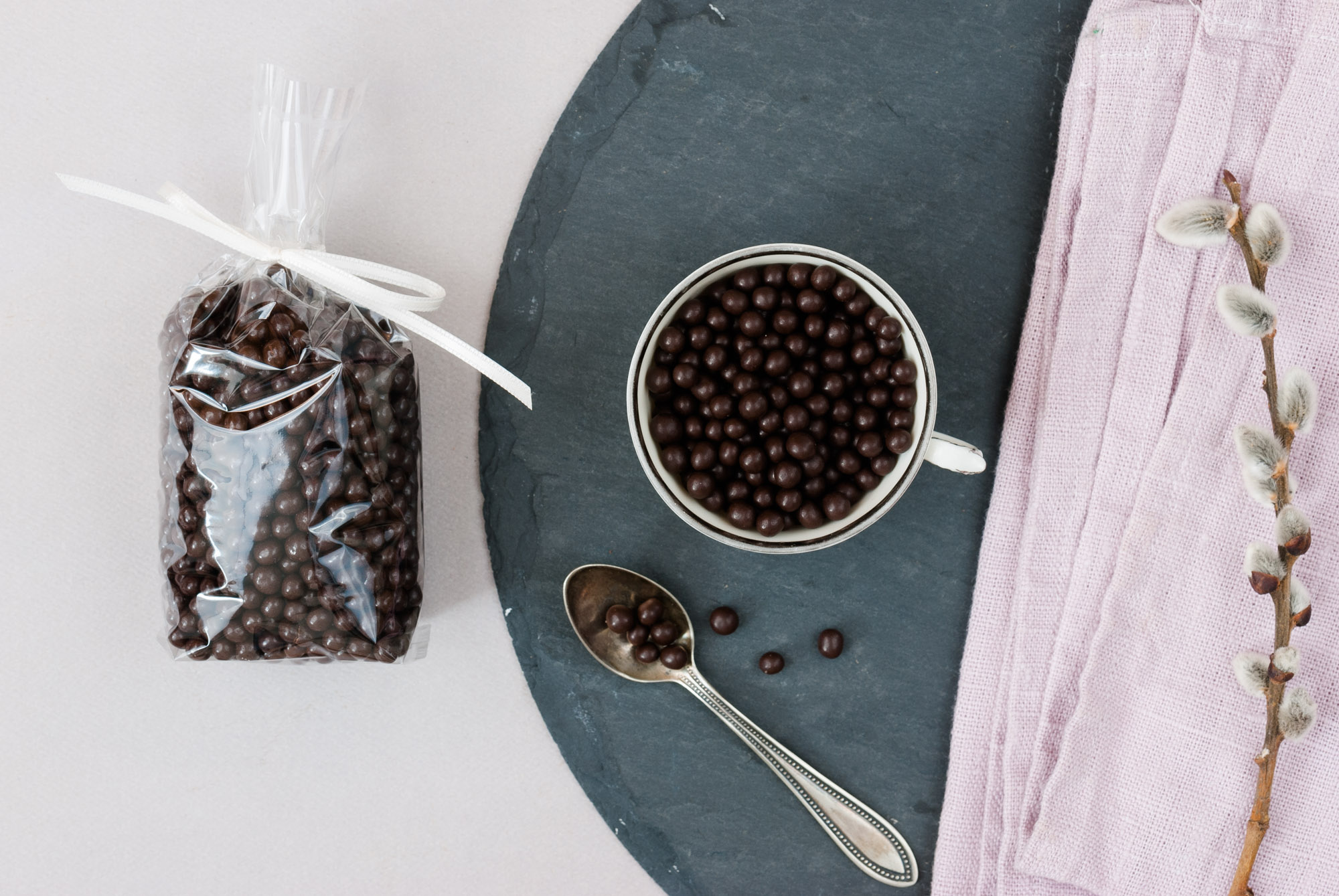 Die kleinen, glänzenden Perlen sind in dunkle Schokolade gehüllt, mit einem knackigen, gerösteten Keks-Kern im Inneren.